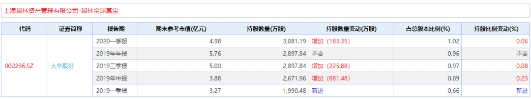 景林资产一季度增持近200万股大华股份只3081万股,持有市值近5亿元。自2019年一季报现身大大华股份前十大流通后,景林全球基金就一直维持对大华股份的增持。