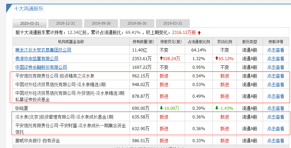 淡水泉一季度极其青睐北大荒,旗下有5只产品进入北大荒的前十大流通股东,分别是“平安信托有限责任公司-投资精英之淡水泉”、“中国对外经济贸易信托有限公司-淡水泉精选1期”、“中国对外经济贸易信托有限公司-外贸信托-淡水泉精选3期私募证券投资基金”、“淡水泉(北京)投资管理有限公司-淡水泉成长基金1期”、“平安信托有限责任公司-平安财富.淡水泉成长一期集合资金信托”,分列第4、5、6、8、9大股东。合计持股数量为4057.53万股,占公司总股本的2.28%。按照期末股价计算,淡水泉5只产品的持仓北大荒的市值约为7亿元。