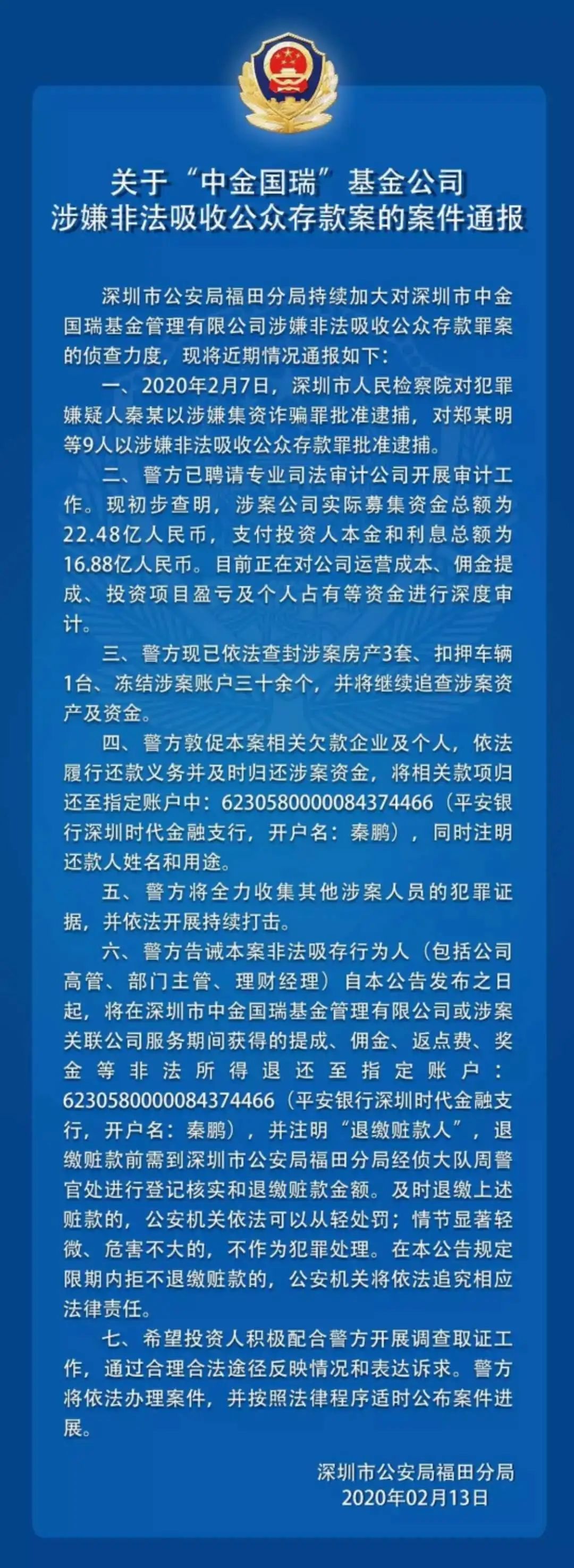 深圳证监局的公告显示,深圳市公安局福田分局在《关于“中金国瑞”基金公司涉嫌非法吸收公众存款案的案件通报》中,对私募基金管理人——深圳市中金国瑞基金管理有限公司(简称“中金国瑞”)涉嫌非法吸收公众存款罪案侦查近况进行通报。早在今年2月,中金国瑞实控人秦鹏以涉嫌集资诈骗罪被批捕;公司还有9名工作人员以涉嫌非法吸收公众存款罪被批捕。随着疫情得到有效控制,众多投资人陆续接到前去接受笔录调查的通知。