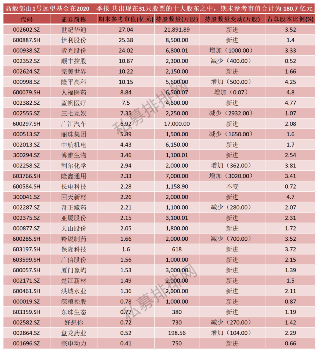 一季报披露期结束,根据wind数据,由高毅资产冯柳担任基金经理的“高毅邻山1号远望基金 ”在 2020年一季报共出现在世纪华通、伊利股份、紫光股份、顺丰控股、完美世界、隆平高科等31只股票的前十大流通股东之中,期末参考市值合计为180.7亿元。