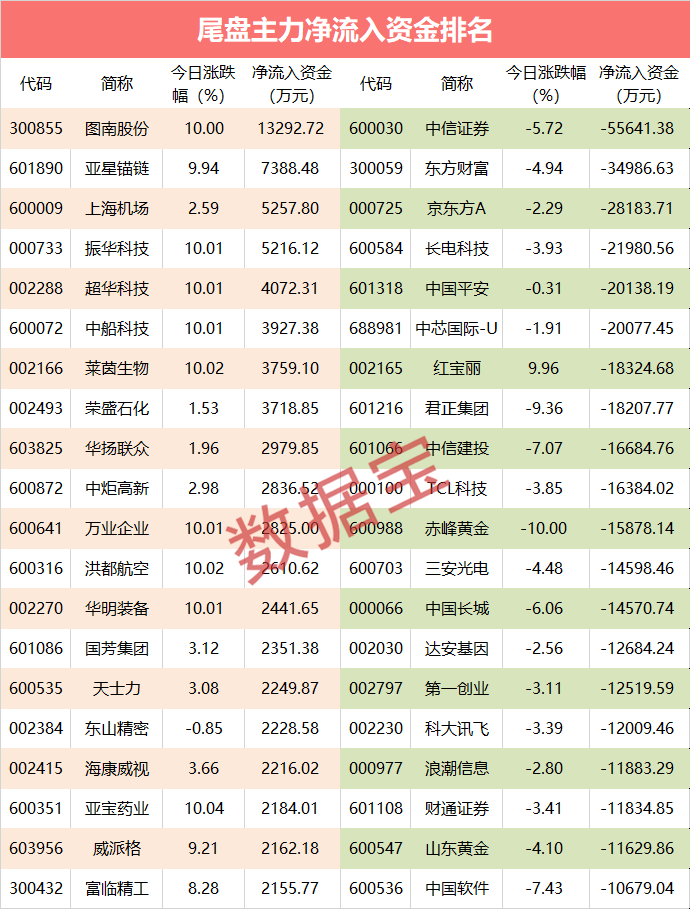从个股方面看,4股尾盘主力资金净流入超5000万元,分别是图南股份、亚星锚链、上海机场、振华科技,其中图南股份尾盘主力资金净流入1.33亿元居首,股价今日涨停,该股已连续5个交易日获得主力资金净流入。亚星锚链尾盘资金流入7000余万元,今日放量涨停。