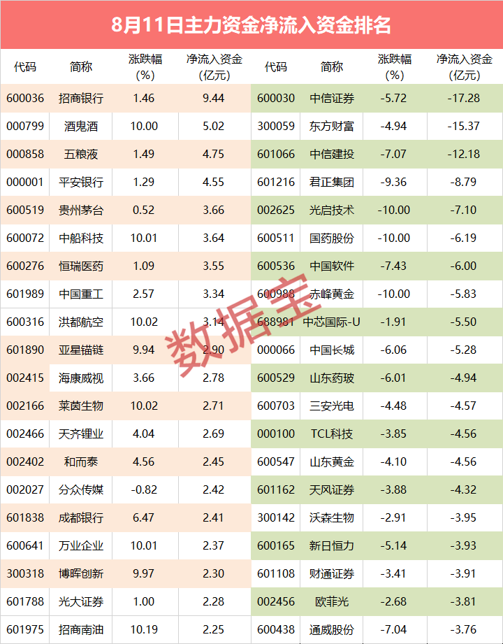 个股方面,56股主力资金净流入超亿元。其中招商银行净流入9.44亿元,资金流入规模居首,股价上涨1.46%。成都银行上涨6.46%,资金净流入2.41亿元。