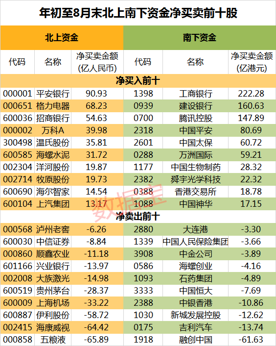 市场开启上升通道,外资一路“买买买”,A股、港股联动越来越密切行情下,北上、南下资金的买卖方向出现了分歧,尤其是南下资金由冷变热。整体来看,北上资金年初至8月末合计净买入1215.99亿元,南下资金合计净买入1476.81亿元。其中南下资金净买入额远超去年全年的924.34亿元,而北上资金净买入额不足去年的一半。