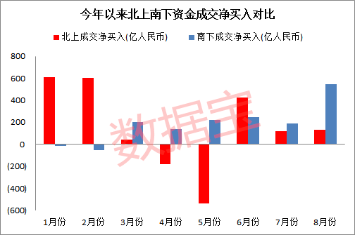 年初1月份及2月份北上资金连续2月净买入额超600亿元,而南下资金却连续2月净卖出;北上资金4月份、5月份连续两月净卖出合计超700亿元,而南下资金自3月份以来持续净买入,并且南下资金于8月份净买入额高达547.93亿元人民币,创下了互联互通机制开通以来月度次新高,同期北上资金净买入额仅有132.06亿元人民币。