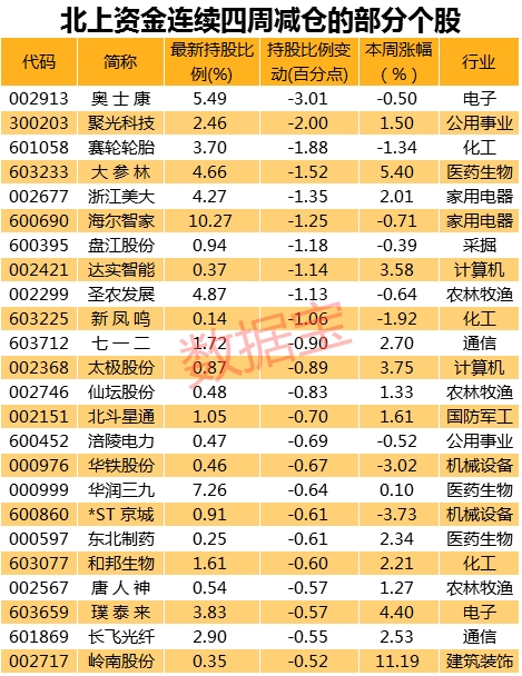 从北上资金减持股来看,岱美股份减仓最为明显,持股比例下降2.3个百分点,减仓幅度较大的还有金石资源、白云机场、丸美股份等。