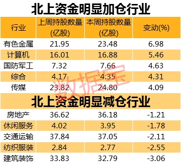 证券时报·数据宝统计显示,本周北上资金持股数量环比增加行业有16个。有色金属、计算机、国防军工等5行业持股数量环比增加4%以上,其中,有色金属行业环比加仓最为明显,北上资金本周末持有该行业23.48亿股,环比增加6.98%。
