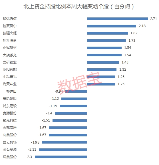 本周北上资金加仓股共763只,加仓比例超0.5个百分点的有58只。具体来看,移远通信加仓比例最为明显,最新持股比例9.48%,环比增加2.71个百分点;紧随其后是拉夏贝尔,持股比例环比增加2.18个百分点;其他加仓比例靠前的还有新疆火炬、旭升股份、永冠新材、大族激光、贵研铂业等。