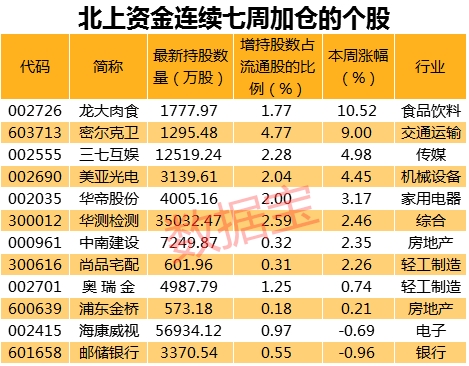 从市场表现来看,北上资金连续七周的加仓股中,上周10股股价上涨,龙大肉食涨幅最大,上涨44.41%,其他涨幅较大的还有密尔克卫、三七互娱等。跌幅较大的有邮储银行等。