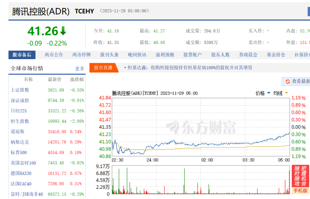 截至美东时间11月28日收盘,腾讯控股(ADR)跌0.22%,报41.26美元。截至11月29日港股收盘,腾讯报收317港元/股,下跌0.81%,总市值3.01万亿港元。