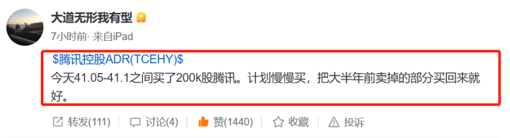 11月29日,段永平在其雪球账号(“大道无形我有型”)称,“今天41.05-41.1(美元)之间买了200k股腾讯(ADR)。计划慢慢买,把大半年前卖掉的部分买回来就好。”
