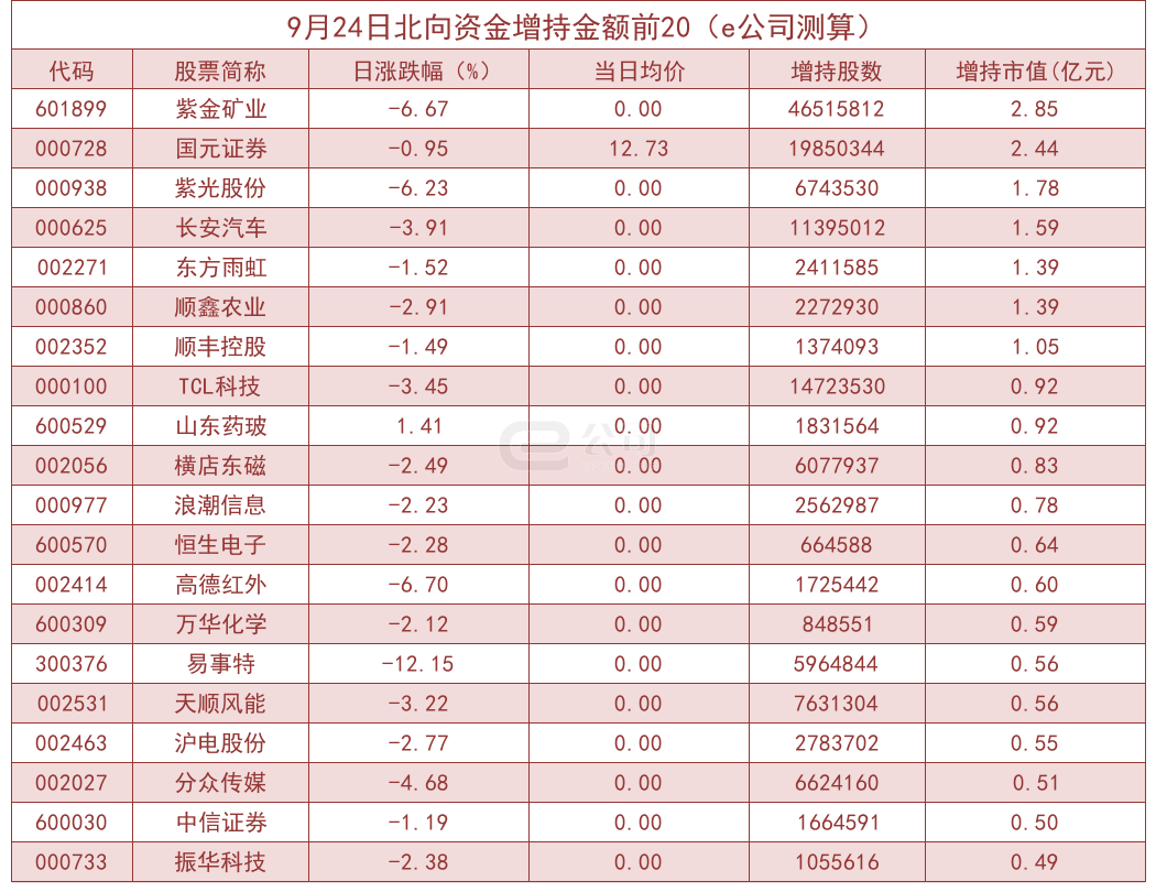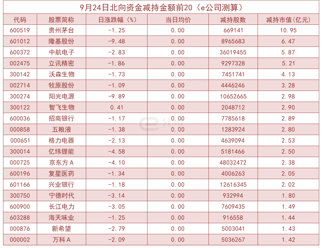 统计数据显示,9月24日北向资金合计净流出121.69亿元。其中沪股通净流出58.89亿元,深股通净流出62.80亿元。北向资金成交金额达到836.57亿元,占A股当日总成交金额比重为12.32%。