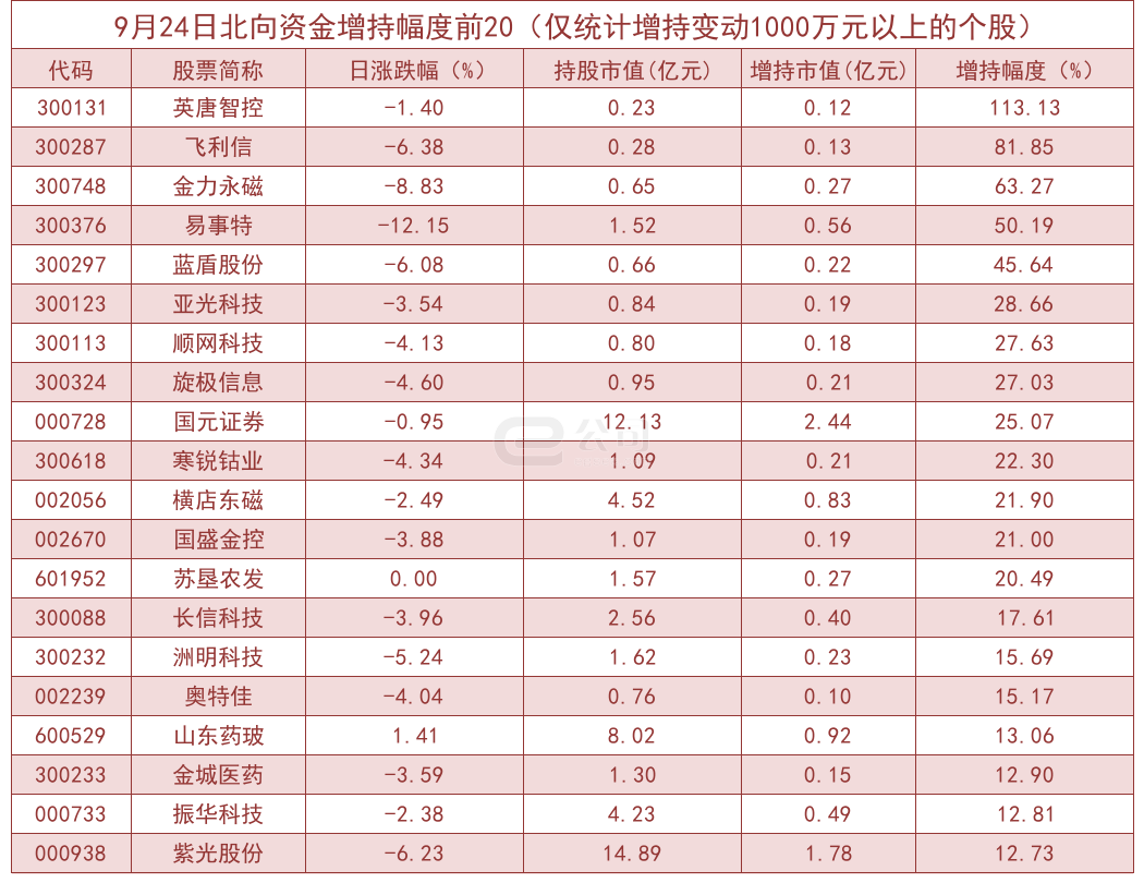 据e公司测算,增减持变动1000万元以上的个股中,英唐智控、飞利信、金力永磁、易事特等获北向资金大幅增持,分别为113.13%、81.85%、63.27%、50.19%。而奇正藏药、中航电子、易成新能、天和防务等减持幅度较大,分别减持63.87%、58.07%、51.76%、49.06%。