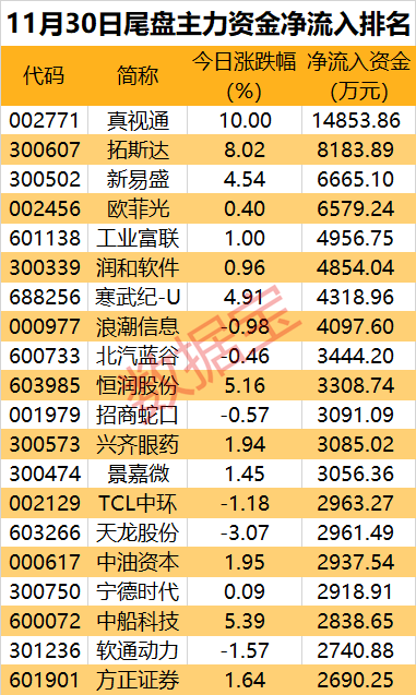 13股尾盘主力资金净流入金额超3000万元。真视通尾盘获净流入1.485亿元,居首位。还有拓斯达、新易盛、欧菲光、工业富联等尾盘主力资金净流入额居前。