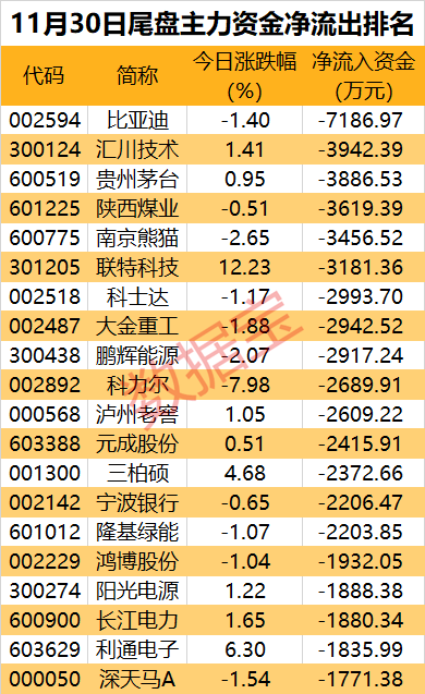 15股尾盘主力资金净流出超2000万元,其中比亚迪尾盘主力资金净流出7186.97万元,居首位。汇川技术、贵州茅台、陕西煤业、南京熊猫等尾盘净流出金额均居前。