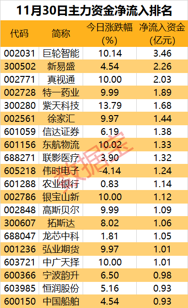 巨轮智能主力资金净流入3.46亿元,居首位,净流入金额创逾3个月新高。该股具备减速器、头盔、机器人等概念,股价开盘后即涨停。