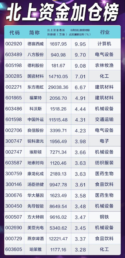 《北上资金加仓榜》中,德赛西威以9.95%的加仓幅度排名榜首,八方股份、德利股份次之,加仓幅度均超过了9%,其他加仓幅度居前的还有国瓷材料、东方雨虹、福莱特、科沃斯等。