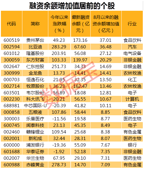 数据宝统计显示,以绝对的融资余额增加额计算,45股的加仓幅度超过5亿元,集中分布在电子、电气设备、医药生物行业中,均有6股。超过10亿元的有11只个股,其中A股龙头贵州茅台以37.01亿元的加仓幅度名列榜首,比亚迪次之,加仓幅度为36.48亿元,加仓幅度居前的其他个股还有隆基股份、东方财富、仁东控股以及新股金龙鱼等。