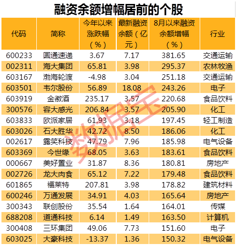 以融资余额相较7月末的增幅计算,50股的加仓幅度超过100%,扎堆在化工行业中,有7股。加仓幅度超150%的有18只个股,其中圆通速递以381.65%排名榜首,海大集团次之,加仓幅度为295.37%,其他居前的个股还有渤海轮渡、韦尔股份、金徽酒、容大感光等。