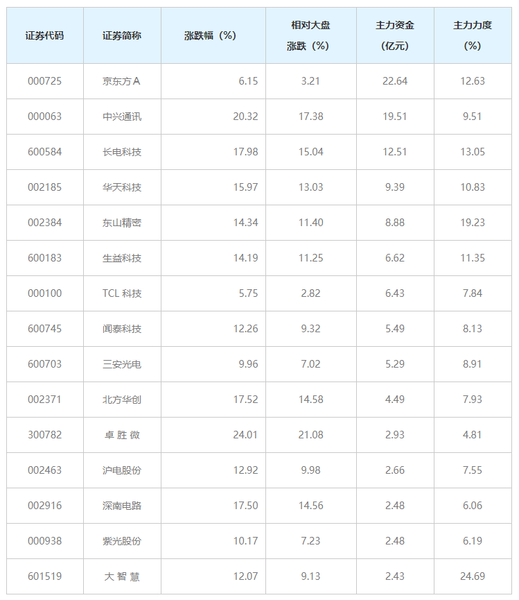 证券时报•数据宝统计,近三日上证指数上涨2.94%,A股成交金额较前三日增加21.27%,主力资金净流入最多的概念为科技龙头,该概念所属个股共有114只,其中主力资金净流入前列的个股是京东方A、中兴通讯、长电科技,分别净流入22.64亿元、19.51亿元、12.51亿元。