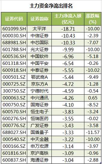 此外,117股被主力资金净卖出超亿元。其中,太平洋、中信证券、中芯国际、光大证券、中国软件主力资金净流出较多,净流出金额分别为18.71亿元、10.43亿元、10.33亿元、9.99亿元、6.96亿元。