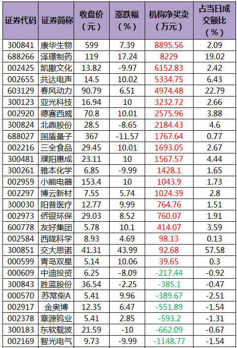 盘后龙虎榜数据显示,机构席位资金净买入9291.94万元,其中,净买入的个股20只,净卖出的个股14只。机构净买入最多的股票是康华生物,净买入金额为8895.56万元;机构净卖出最多的股票是沈阳化工,净卖出金额为10198.22万元。