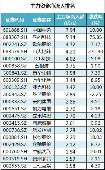 具体到个股来看,38股主力资金净流入超亿元。其中,中国中免、孚能科技、歌尔股份、山大地纬、TCL科技主力资金净流入居前,净流入金额分别为7.94亿元、5.34亿元、4.72亿元、4.2亿元、4.02亿元。