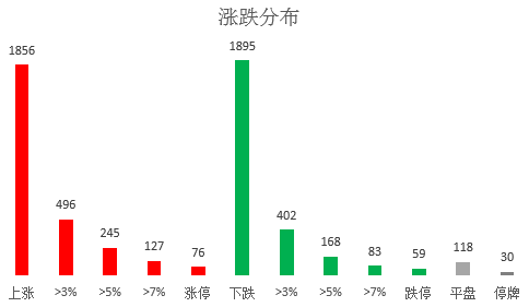 截至收盘,沪深两市合计1856只个股上涨,1895只个股下跌。包括ST股在内,共有76只个股涨停,59只个股跌停。