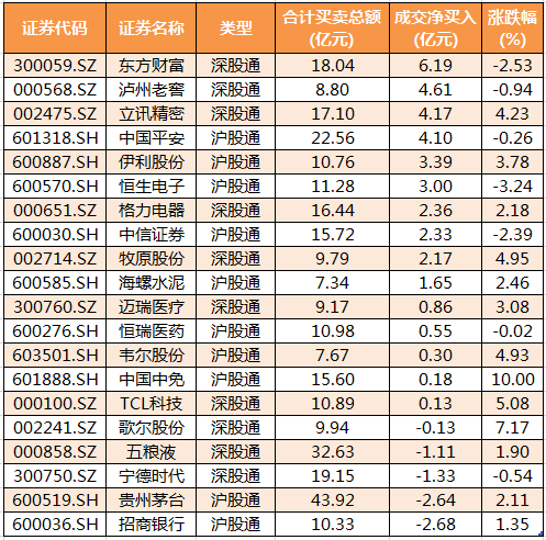 个股方面,东方财富、泸州老窖、立讯精密、中国平安、伊利股份北向资金净买入金额居前,净买入金额分别为6.19亿元、4.61亿元、4.17亿元、4.1亿元、3.39亿元;招商银行、贵州茅台、宁德时代、五粮液、歌尔股份北向资金净卖出较多,净卖出金额分别为2.68亿元、2.64亿元、1.33亿元、1.11亿元、0.13亿元。