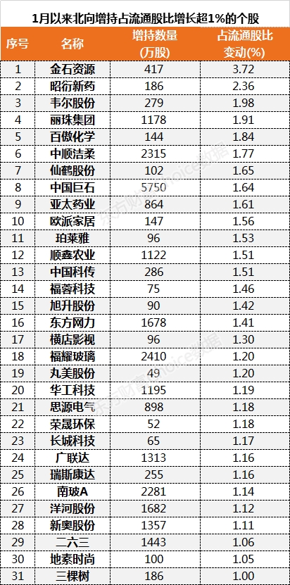 东方财富Choice数据显示,1月以来有800多只陆股通标的获北向资金增持,占比68%。其中资源类个股和医药类个股更获青睐,比如排名第1和第2分别是金石资源和昭衍新药。