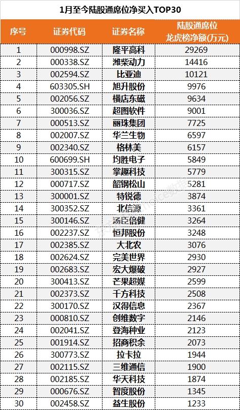 个股方面,隆平高科、潍柴动力、比亚迪等净买入额超亿元,旭升股份、横店东磁、超图软件、丽珠集团、华兰生物、格林美、均胜电子、掌趣科技、韶钢松山等净买入额超5千万元。