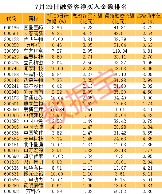 证券时报?数据宝统计显示,7月29日共有976只股获融资净买入,净买入金额在千万元以上的有352只,其中29只融资净买入额超亿元。复星医药融资净买入额居首,当日净买入5.23亿元,其次是长春高新、智飞生物,融资净买入金额分别为4.12亿元、3.81亿元,融资净买入金额居前的还有五粮液、东方财富、蓝思科技等。