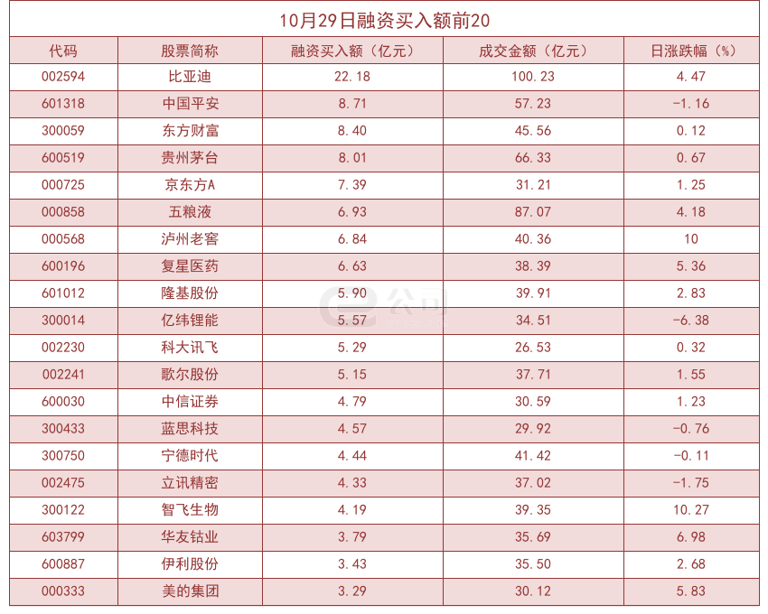 从融资资金买入金额来看,共有118只个股买入金额超亿元,其中比亚迪(22.18亿元)、中国平安(8.71亿元)、东方财富(8.40亿元)居前三位。