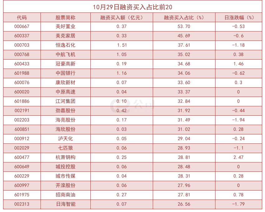 个股方面,沪深两市共有1831只个股有融资资金买入。从融资买入额占当日总成交金额比重来看,共有97只股票融资买入额占比超20%,其中美好置业(53.70%)、美克家居(45.69%)、恒逸石化(37.61%)排名前三。