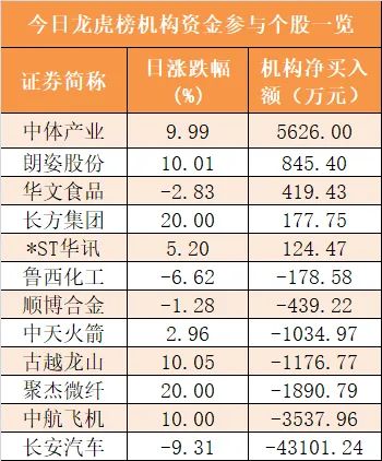 盘后龙虎榜数据显示,机构现身12股,其中中体产业等5股呈现机构资金净买入,长安汽车等7股呈现机构资金净卖出。