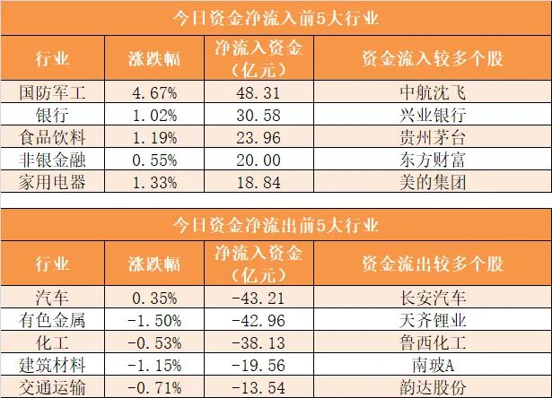 28个申万一级行业中,14个行业实现资金净流入,其中国防军工行业净流入48.31亿元居首。