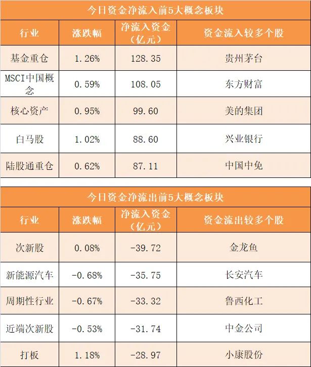 概念板块方面,今日基金重仓、MSCI中国概念、核心资产、白马股等概念板块资金呈现净流入,其中基金重仓概念净流入128.35亿元居首。