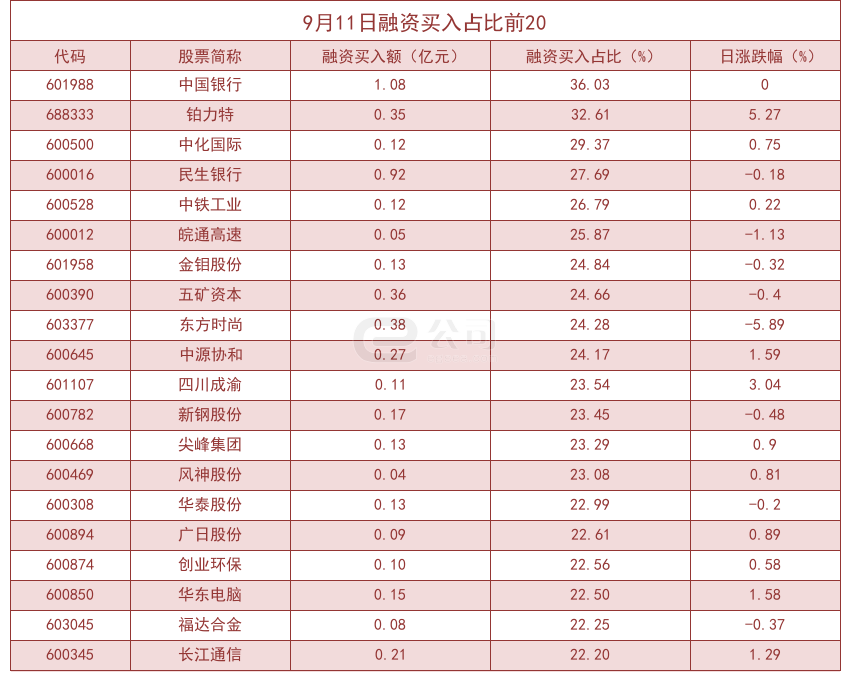 个股方面,沪深两市共有972只个股有融资资金买入。从融资买入额占当日总成交金额比重来看,共有31只股票融资买入额占比超20%,其中中国银行(36.03%)、铂力特(32.61%)、中化国际(29.37%)排名前三。