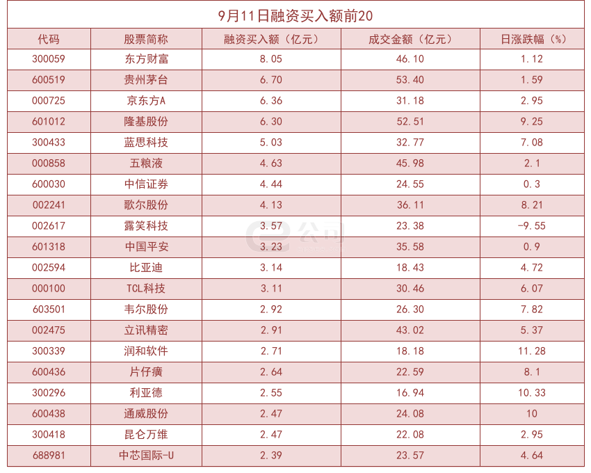 从融资资金买入金额来看,共有88只个股买入金额超亿元,其中东方财富(8.05亿元)、贵州茅台(6.70亿元)、京东方A(6.36亿元)居前三位。