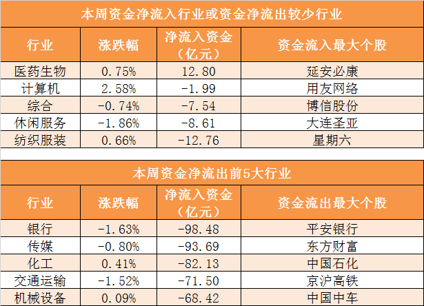 本周28个申万一级行业中,仅医药生物一个行业实现资金净流入,银行、传媒、化工、交通运输等行业净流出规模居前,其中银行业净流出98.48亿元居首。