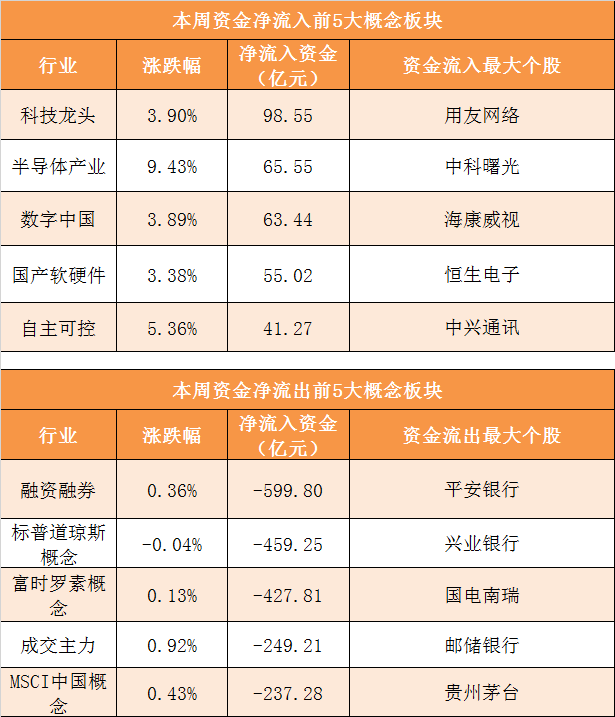 概念板块方面,本周科技龙头、半导体产业、数字中国、国产软硬件等概念板块资金呈现净流入,其中科技龙头概念净流入98.55亿元居首。