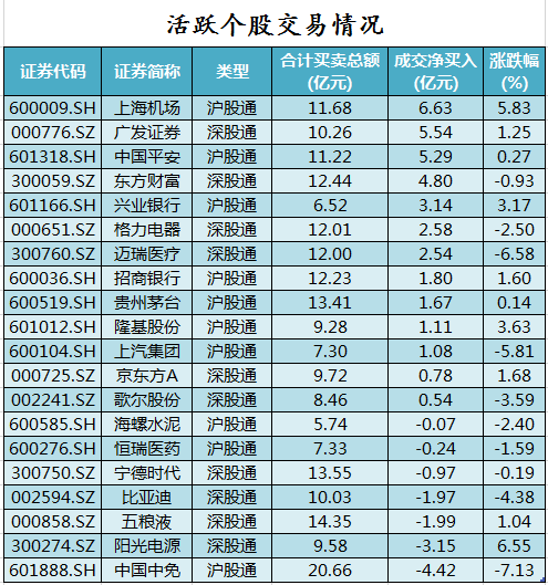 活跃个股方面,上海机场、广发证券、中国平安、东方财富、兴业银行北向资金净买入较多,净买入金额分别为6.63亿元、5.54亿元、5.29亿元、4.8亿元、3.14亿元;中国中免、阳光电源、五粮液、比亚迪、宁德时代北向资金净卖出较多,净卖出金额分别为4.42亿元、3.15亿元、1.99亿元、1.97亿元、0.97亿元。