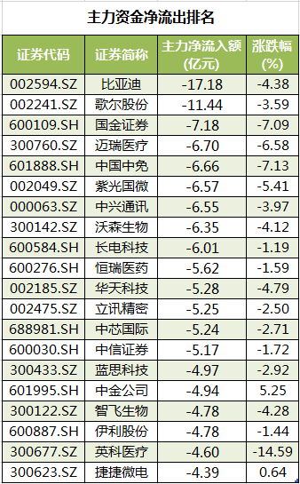 此外,133股被主力资金净卖出超亿元。其中,比亚迪、歌尔股份、国金证券、迈瑞医疗、中国中免主力资金净流出较多,净流出金额分别为17.18亿元、11.44亿元、7.18亿元、6.7亿元、6.66亿元。