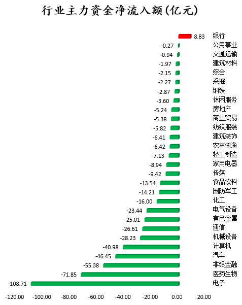 从行业板块来看,申万所属的28个一级行业,仅有银行1个行业板块主力资金呈现净流入,净流入金额为8.83亿元;27个行业板块主力资金呈现净流出,其中,电子、医药生物、非银金融、汽车、计算机行业板块主力资金净流出较多,净流出金额分别为108.71亿元、71.85亿元、55.38亿元、46.45亿元、40.98亿元。