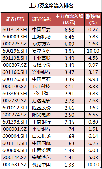 具体到个股来看,26股主力资金净流入超亿元。其中,中国平安、上海机场、京东方A、复星医药、工业富联主力资金净流入居前,净流入金额分别为6.58亿元、6.46亿元、6.09亿元、3.95亿元、3.49亿元。