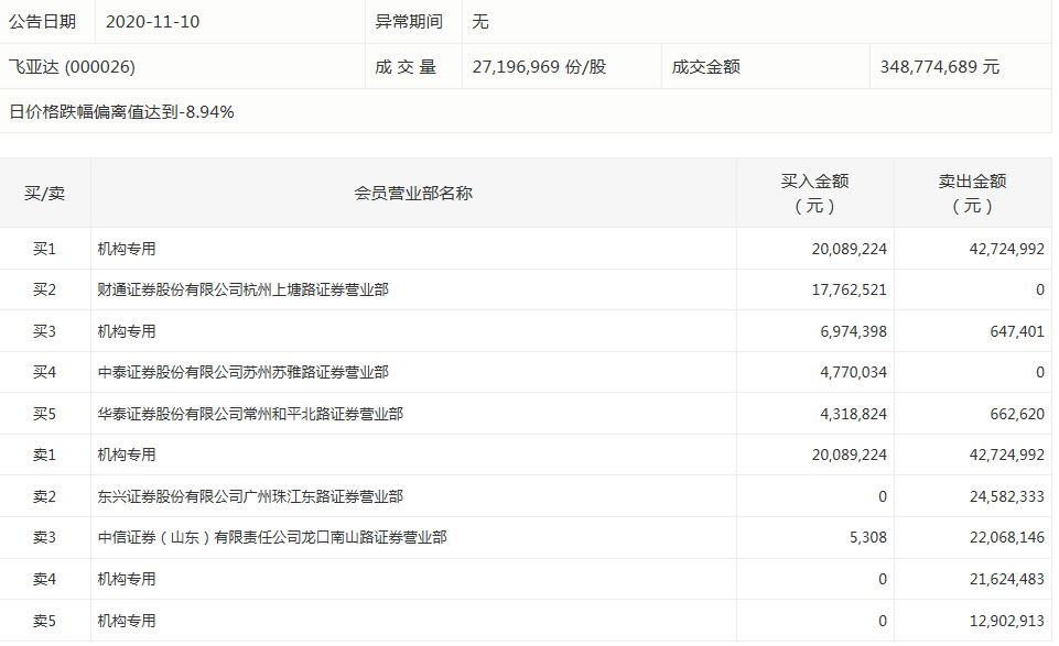 飞亚达今天跌停。盘后数据显示,5个机构出现在龙虎榜单上,分别位列买1、买3、卖1、卖4及卖5席位,合计净卖出5083.62万元;财通证券股份有限公司杭州上塘路证券营业部买入1776.25万元;东兴证券股份有限公司广州珠江东路证券营业部卖出2458.23万元。