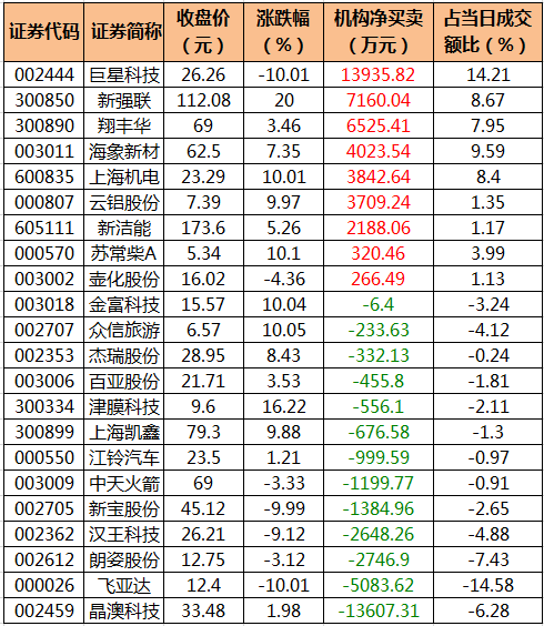 盘后龙虎榜数据显示,机构席位资金净买入1.2亿元,其中,净买入的个股9只,净卖出的个股13只。机构净买入最多的股票是巨星科技,净买入金额为13935.82万元;机构净卖出最多的股票是晶澳科技,净卖出金额13607.31万元。