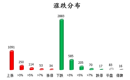 截至收盘,沪深两市合计1091只个股上涨,2883只个股下跌,平盘个股83只,停牌的个股16只。包括ST股在内,共有34只个股涨停,17只个股跌停。