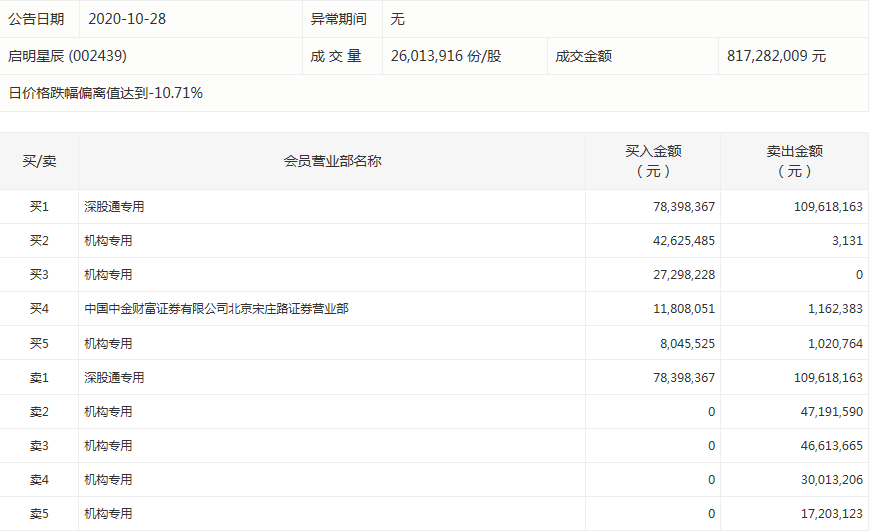 启明星辰今天跌停。盘后数据显示,7个机构出现在龙虎榜单上,分别位列买2、买3、买5、卖2、卖3、卖4及卖5席位,合计净卖出6407.62万元;中国中金财富证券有限公司北京宋庄路证券营业部买入1180.81万元,同时卖出116.24万元。