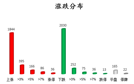 截至收盘,沪深两市合计1844只个股上涨,2030只个股下跌,平盘个股165只,停牌的个股22只。包括ST股在内,共有36只个股涨停,13只个股跌停。