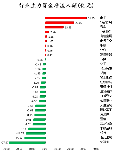 从行业板块来看,申万所属的28个一级行业,有9个行业板块主力资金呈现净流入,其中,电子、食品饮料、汽车、休闲服务、有色金属行业板块主力资金净流入居前,净流入金额分别为31.85亿元、22.06亿元、13.93亿元、2.76亿元、1.18亿元;19个行业板块主力资金呈现净流出,其中,计算机、医药生物、银行、非银金融、农林牧渔行业板块主力资金净流出较多,净流出金额分别为27.97亿元、15.92亿元、14.72亿元、13.13亿元、9.52亿元。
